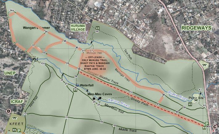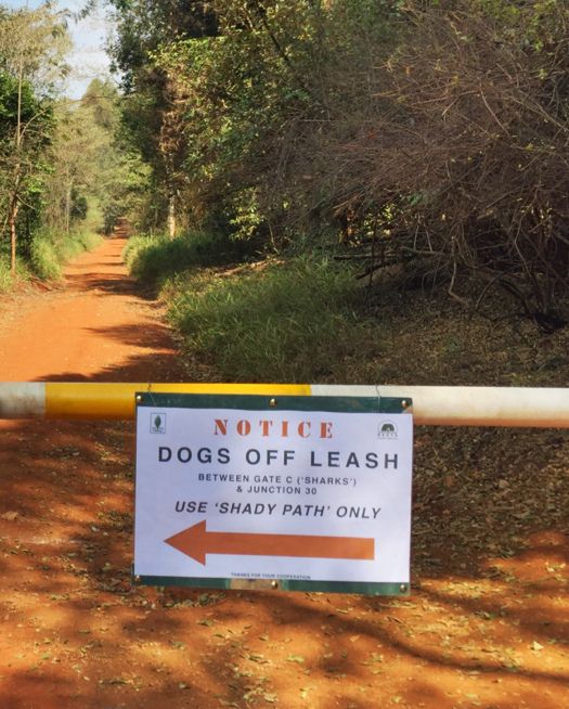 The popular stretch of Wangari Maathai Track between Gate-C (a.k.a. Sharks) on Kiambu Road and junction 30 is now a dogs-ON-leash zone.