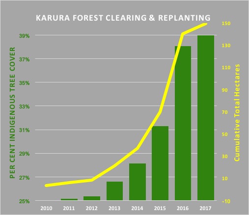 Nearly 20% of the joint FKF-KFS joint management plan goal to return Karura to its natural state has been achieved with some 150 ha (370 acres) having been cleared and either replanted or naturally enriched.