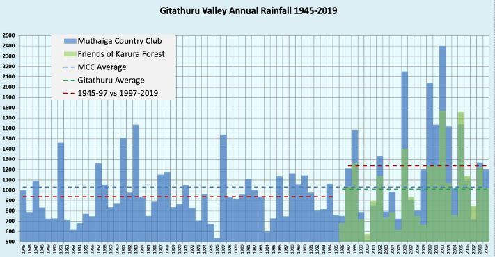 Karura Forest, like much of Kenya, is wetter than usual. The ‘short rains’ so far are amongst the wettest in the last 74 years, and as of mid-December, they were not over yet! Is the Karura Forest area getting wetter? The answer is yes. An analysis of seven decades of rainfall data — records from the Muthaiga Country Club since 1945 combined with records kept by Friends of Karura since 1994 — shows that that the average rainfall of the last two decades is about 200mm higher than the annual average from the preceding five decades, an increase from 830 mm per rain-year to just over 1,020 mm. You can find a preliminary report below