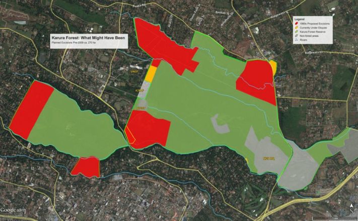 What might have been! On the Google Earth image above we show the areas (in red) of Karura Forest Reserve that had been extra-legally allocated. Many if not most of those were on the list that were recently revoked by the Nairobi Land Commission.